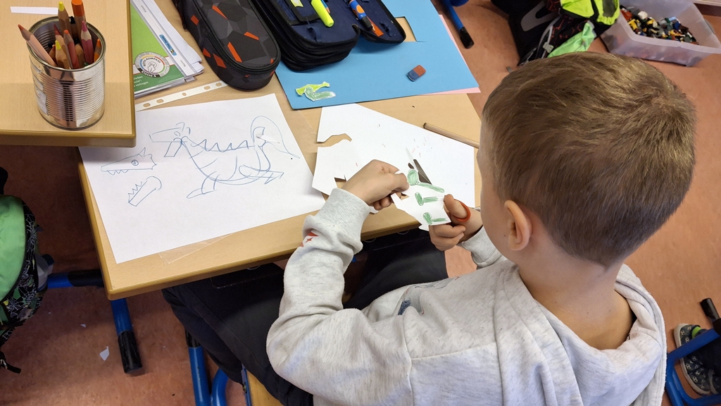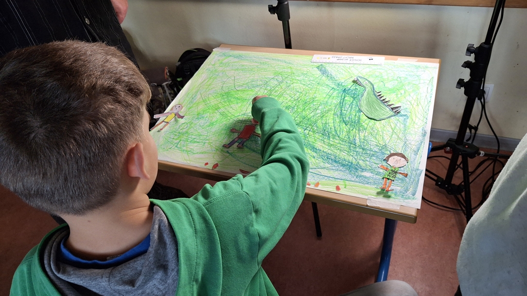 Im Vorfeld hatten die Jungen und Mädchen sich intensiv mit dem Thema „Drachen“ beschäftigt sowie bereits eine eigene Drachengeschichte verfasst. Nun galt es in einem ersten Arbeitsschritt, innerhalb kleiner Gruppen alle einzelnen Ideen zu jeweils einer gemeinsamen Geschichte zusammen zu bringen. Dabei sollte darauf geachtet werden, dass die Geschichte nicht zu komplex ist, damit sie später gut umgesetzt werden konnte. Damit die Kinder eine Vorstellung von der Entstehung eines eigenen Films bekommen konnten, schauten sie sich ein kleines Video an, in dem die Arbeitsschritte erklärt und Beispielfilme gezeigt wurden.