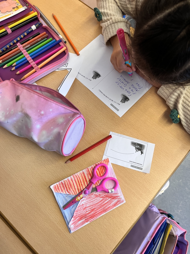 Beim Vorlesen des Buches wurde die Geschichte immer wieder durch kurze kreative Arbeitsphasen unterbrochen. So entstanden viele freie Schreibanlässe, bei denen die Kinder ihre eigenen Lieblingswörter entdeckten, erfanden und aufschrieben. Ein besonderes Highlight war das Basteln der persönlichen Wort-Schatztruhe: Jede Schülerin und jeder Schüler gestaltete eine eigene kleine Truhe und füllte sie mit ganz individuellen „Wortschätzen“. Neben Lieblingswörtern fanden darin auch Wörter Platz, die die Kinder von ihren Mitschülern geschenkt bekamen – eine liebevolle Geste, die für viel Freude und Staunen sorgte. Der Thementag war für alle ein rundum gelungenes Erlebnis. Er bot nicht nur viele kreative Schreibmomente, sondern stärkte auch die Klassengemeinschaft nachhaltig. So wurde Sprache auf spielerische Weise zu einem echten Schatz, den die Kinder mit nach Hause nehmen konnten.