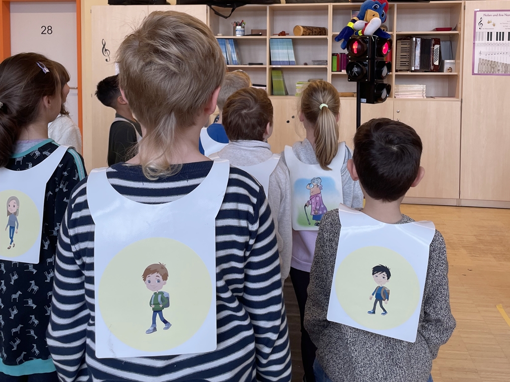 Im Rahmen des ADAC-Verkehrstrainings bekamen die ersten Klassen Besuch von ADAC und dem Raben ADACUS. Dieser erklärte uns, wie man richtig über die Ampel geht und worauf man beim Überqueren der Straße besonders achten muss. Nach einer kurzen Theorieeinheit durften wir selbst loslegen, in verschiedene Rollen schlüpfen und unser Wissen zeigen. So wurden manche zu Autofahrern, Fußgängern oder Rollerfahrern. Nun hieß es: Aufpassen!