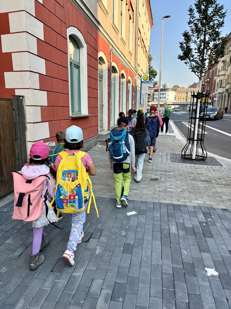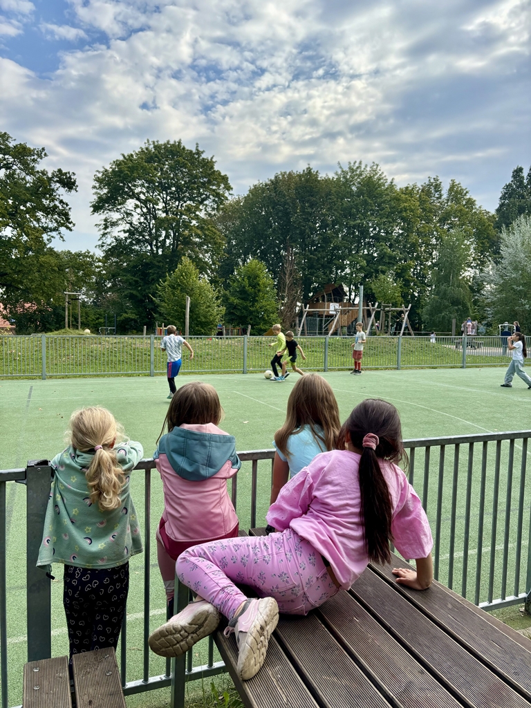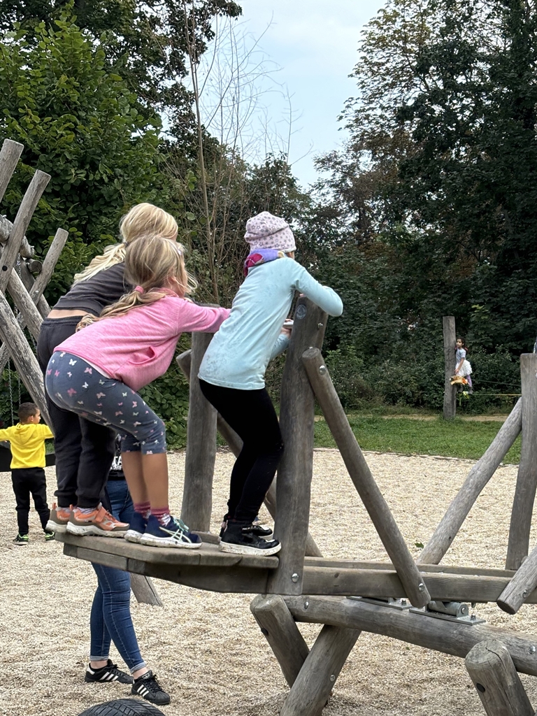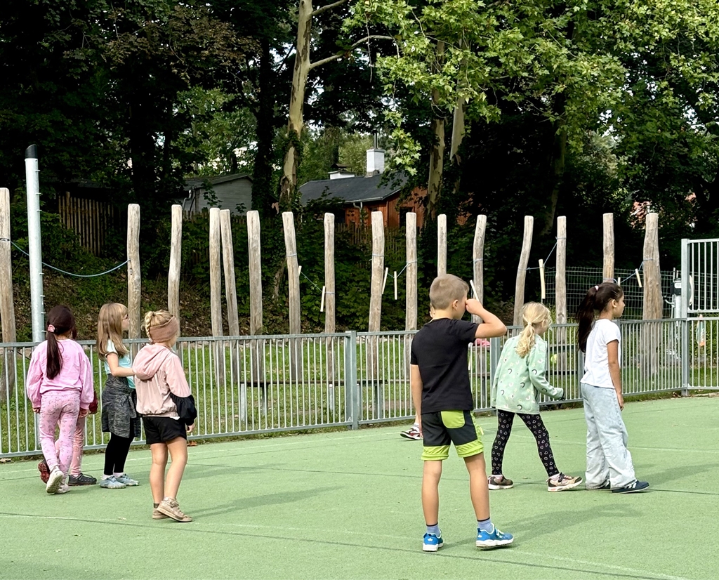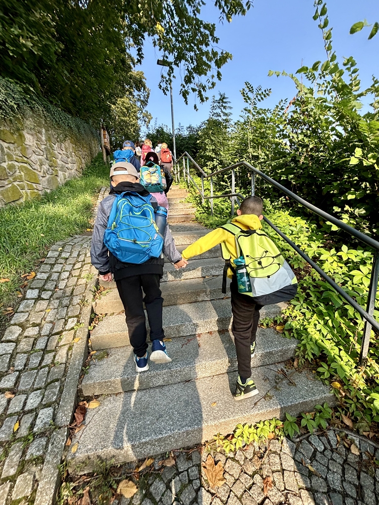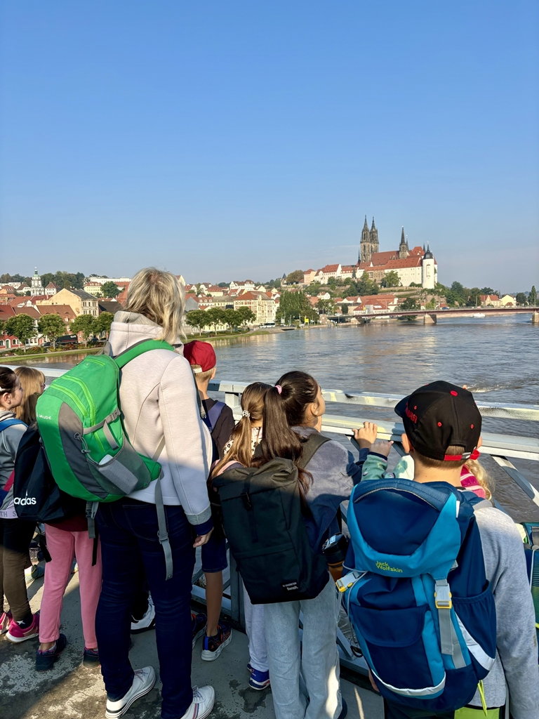 Am 19.09.2024 starteten die Patenklassen 1a und 3c ihren ersten gemeinsamen Wandertag. Je ein großes Kind lief gemeinsam mit einem kleinen über die Brücke, vorbei an besonderen Stellen der Meißner Altstadt und schließlich die Treppen nach oben zum Spielplatz an der Jahnhalle. Dort angekommen stärkten sich beide Klassen erst einmal bei einem Picknick, bevor der gesamte Spielplatz erkundet wurde. Bei strahlendem Sonnenschein wurde viel balanciert, geklettert, geschaukelt, gewippt und Fußball sowie Verstecke gespielt.