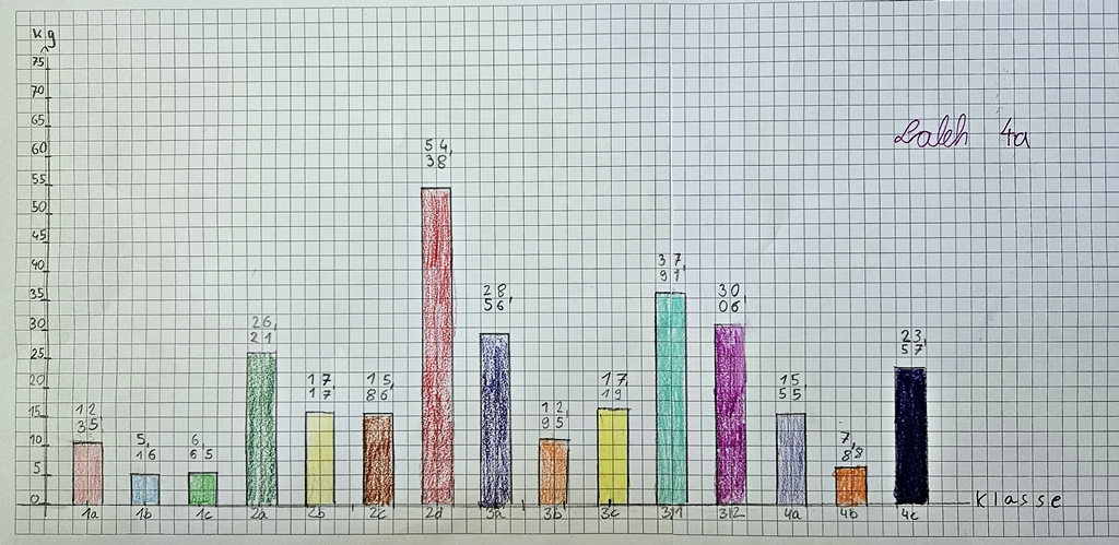 Im Diagramm unten sind die gesammelten Kilogramm pro Schüler jeder Klasse übersichtlich dargestellt. An der Spitze stehen dabei: