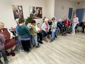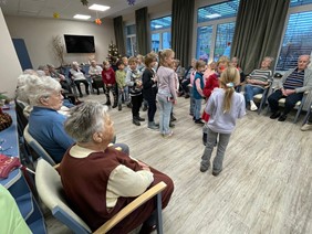 Die Klasse hatte ein kleines Programm mit Weihnachtsliedern, Gedichten und einem Flötenspiel vorbereitet. Vor allem bei den Liedern haben die älteren Herrschaften froh mitgesungen, das hat die Kinder sehr beeindruckt.