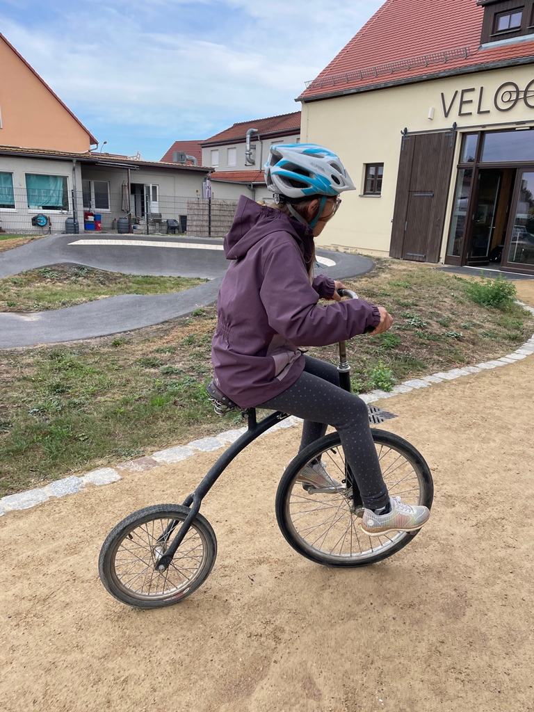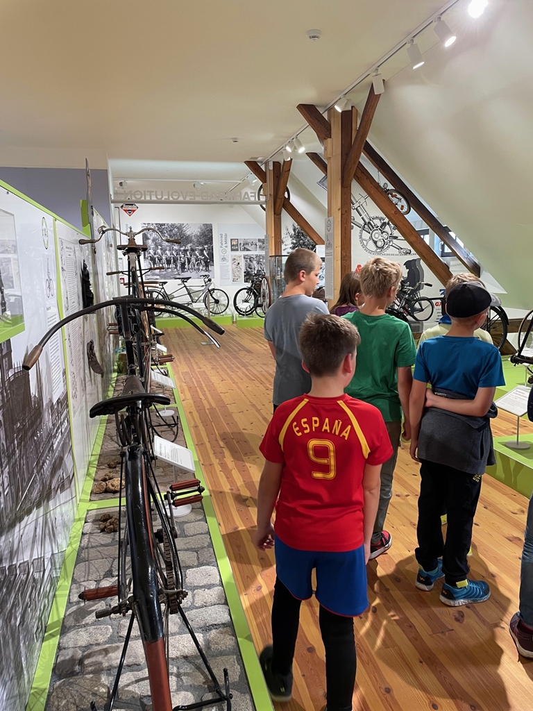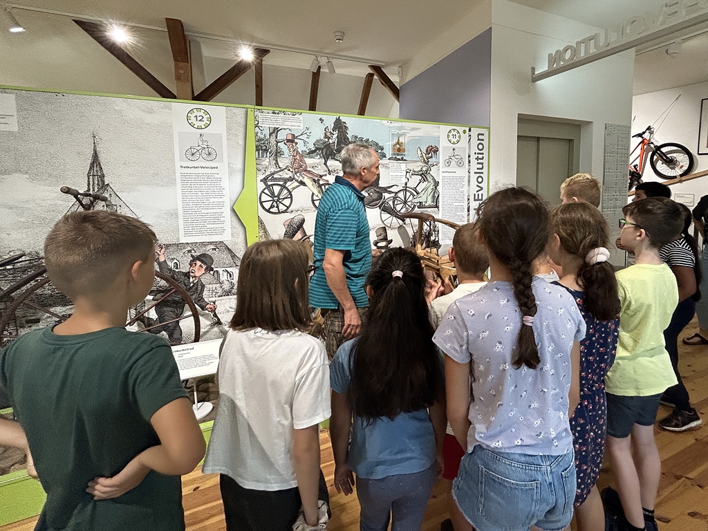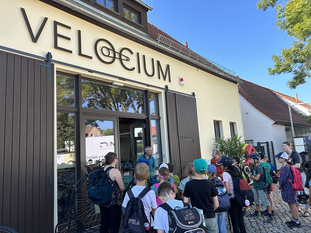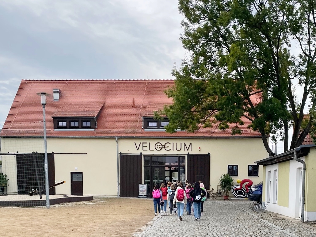 Im Rahmen des Projektes "Fahr Rad- aber sicher" machten sich die 4. Klassen auf den Weg nach Weinböhla, um das Fahrradmuseum "Velocium" zu besuchen. Dort gab es jede Menge Räder aus der Vergangenheit zu bestaunen. Wer sich traute, konnte sogar auf ein Hochrad hinaufklettern. Der Museumsleiter erzählte während der Führung interessante Details über Lebensweise und Technik in früheren Jahren. Außerdem konnten alle verschiedene Fahrräder auf der extra angelegten Abenteuerstrecke im Außenbereich ausprobieren. Einige Kinder machten einen kleinen Wettbewerb an den Fahrradsimulatoren.