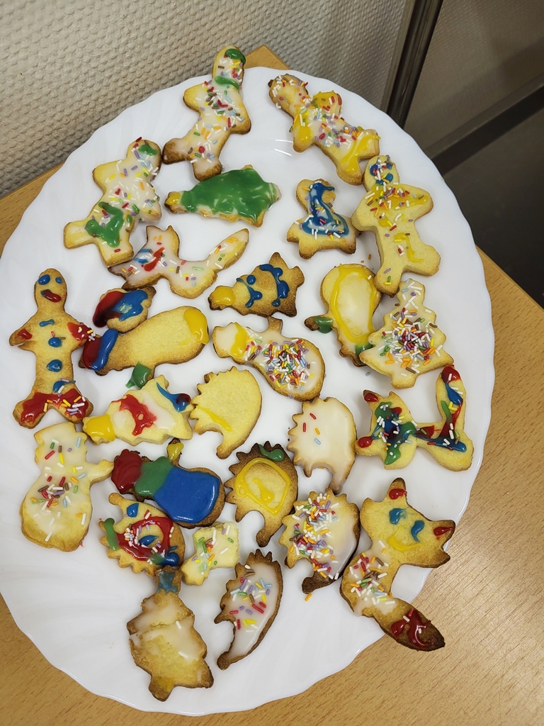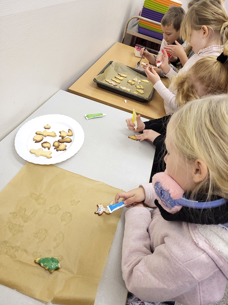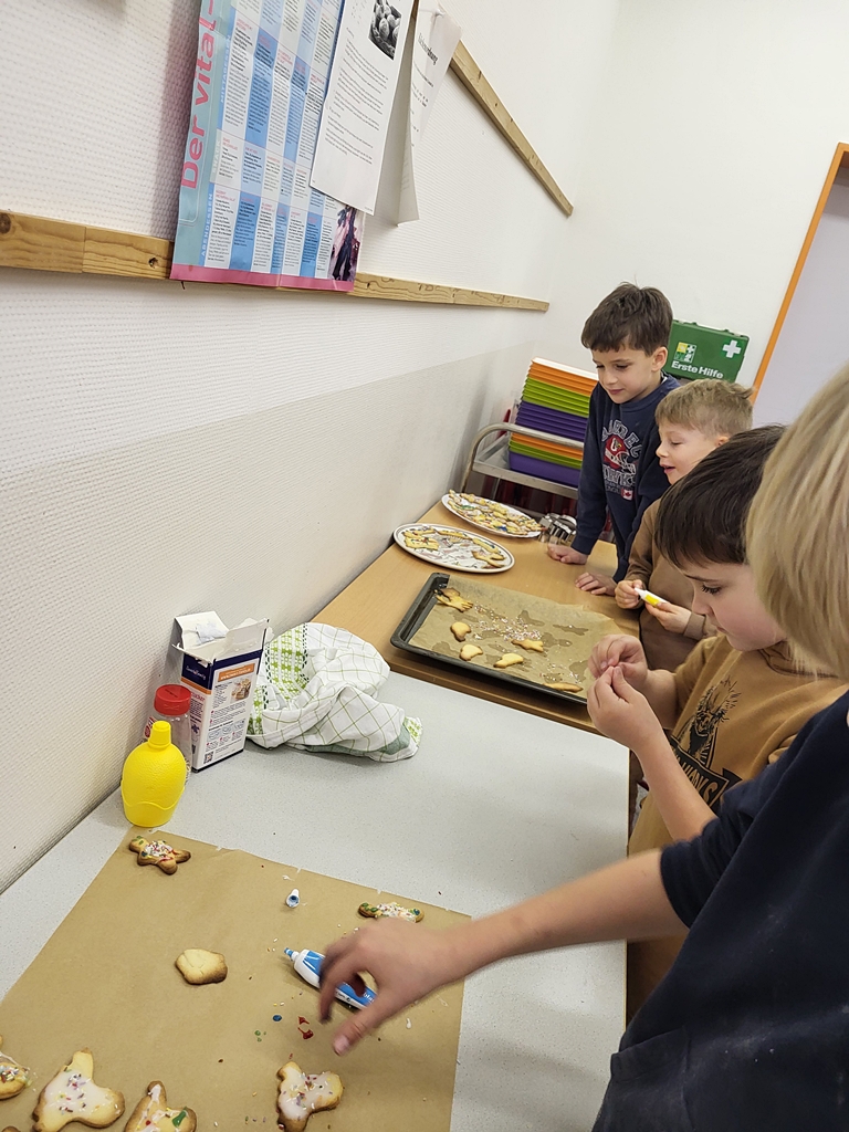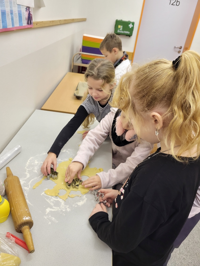Am 17.12. verwandelten sich die Kinder der Klasse 2a in fleißige Bäckerinnen und Bäcker. In kleinen Gruppen wurde der vorbereitete Teig erst ausgerollt und mit dem jeweiligen Lieblingsausstecher ausgestochen. Dann wurden die Plätzchen vorsichtig auf die Bleche gelegt, gebacken und im Anschluss mit Zuckerguss, Lebensmittelfarben und Streuseln kunstvoll verziert. Dank unserer lieben Wichtel konnten wir uns die Weihnachtsprojekttage mit wunderhübschen und sehr leckeren Plätzchen versüßen.